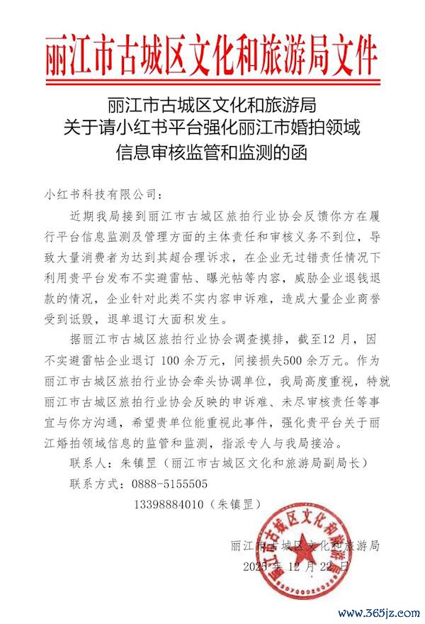 快科技 12 月 23 日音书,云南丽江市古城区文化和旅游局本日公建筑布《对于请小红书平台强化丽江市婚拍界限信息审核监管和监测的函》。